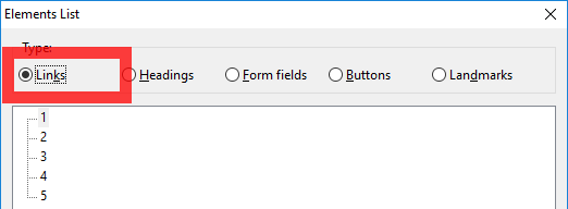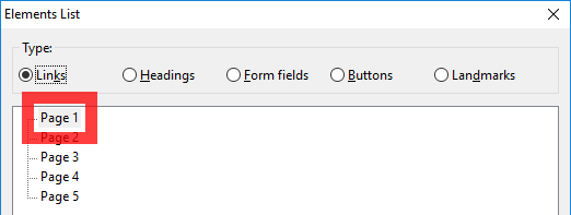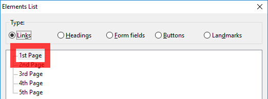 The links list window within NVDA showing each link on the pagination control, as the links are viewed outside of the page they’re not understandable.