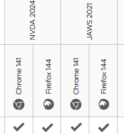 If required use the screen reader compatibility matrix to validate the combinations you support and document any known differences. This helps everyone understand what is consistent, what varies, and what to watch for during sign-off.
